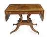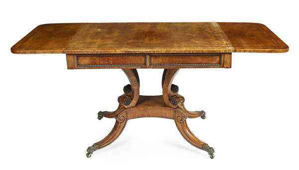 the rounded rectangular drop leaf top above two real and two opposing dummy frieze drawers, raised on four patera carved scroll supports, ending in sabre legs with brass hairy paw feet and castors