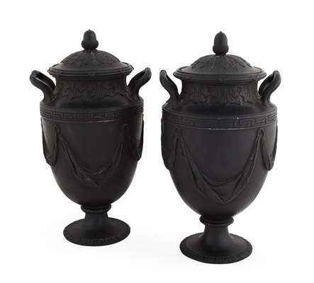 PAIR OF WEDGWOOD BASALT COVERED URNS