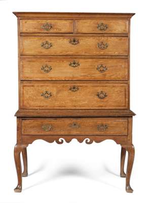 GEORGE II OAK AND WALNUT BANDED CHEST ON STAND