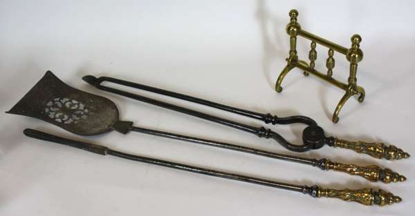 SET OF THREE STEEL AND BRASS FIRE IRONS