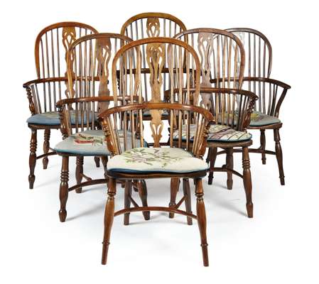 ASSEMBLED SET OF SIX YEW WOOD AND ELM WINDSOR ARMCHAIRS