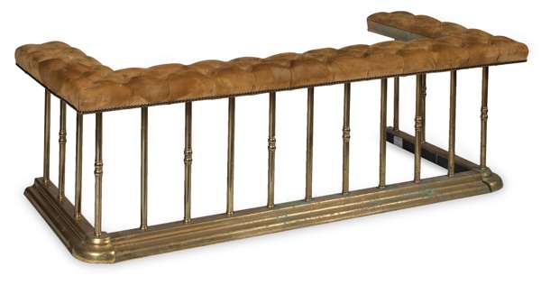 GEORGE III STYLE BRASS AND LEATHER UPHOLSTERED CLUB FENDER
