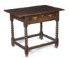 the rectangular top over a single frieze drawer raised on bobbin turned legs joined by peripheral stretchers