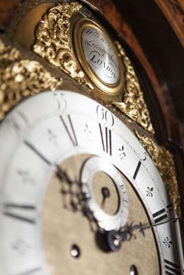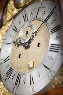 the arched cornice with a fret carved frieze over an arched glazed door flanked by columns, the brass and silvered dial with Roman and Arabic chapters, subsidiary seconds dial and date aperature, two winding holes and pierced brass spandrels, the boss inscribed 'Will Wright & Henry Felton, London', arched trunk door and moulded plinth base