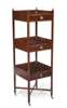 the square top with a three quarter gallery and turned corner finials over a single drawer, above two further galleried tiers with drawers, raised on square legs joined by an X-form stretcher, with brass caps and castors