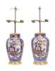 typically painted with fenced gardens on a foliate ground with panels of birds and flowers, now converted as lamps (2)