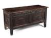 the rectangular hinged top bearing engraved date 1689, over a scroll carved frieze and double panel front with arched foliate carving, raised on stile feet