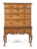 the moulded cornice over two short and three long drawers, the stand with a long drawer over a scrolled apron, raised on cabriole legs ending on pad feet