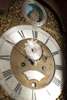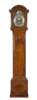 the arched moulded cornice over a key carved frieze and arched glazed door flanked by three quarter columns, the brass and silvered dial with Roman and Arabic chapters, a moving ship aperture, seconds dial and date aperture, and pierced brass spandrels, eight day movement, the trunk with an arched door and fluted angles, on a plinth base