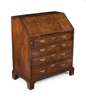 the slant front opening to an arrangement of pigeon holes and small drawers over a green leather lined writing surface and recessed well, above four graduated long drawers with herringbone inlay, raised on bracket feet