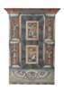 the deep faux marble painted cornice inscribed 'Esbetha Bimmermann 1809' over a painted cupboard door depicting scenes of figures in landscapes, flanked by trompe l'oeil painted panels of flowering urns against a blue ground