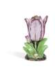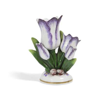 the first with four purple edged flowers and leaves on a domed foot with applied flowers and gilt details, gold anchor mark, 16cm high; the other with two pink flowers and five leaves, on a naturalistic domed base with applied flower, unmarked 15cm high (2)