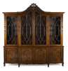 of neat size, the arched and moulded cornice centred by a pierced foliate cresting over a pair of astragal glazed doors carved with wheat sheaves and opening to shelves, flanked by similar side cabinets, all carved with trailing roses; the lower part with four foliate scroll carved doors, raised on foliate carved scrolled feet