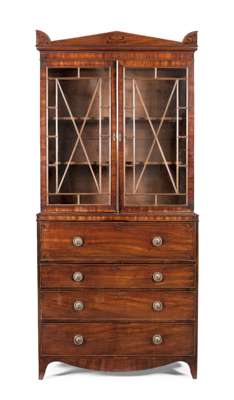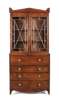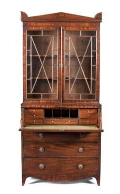 the arched pediment inlaid with anthemion over a plain frieze and a pair of glazed and mullioned doors opening to shelves; the lower part with a drop front drawer fitted for writing with an arrangement of drawers and pigeon holes, over three graduated long drawers and a serpentine apron, raised on splay feet