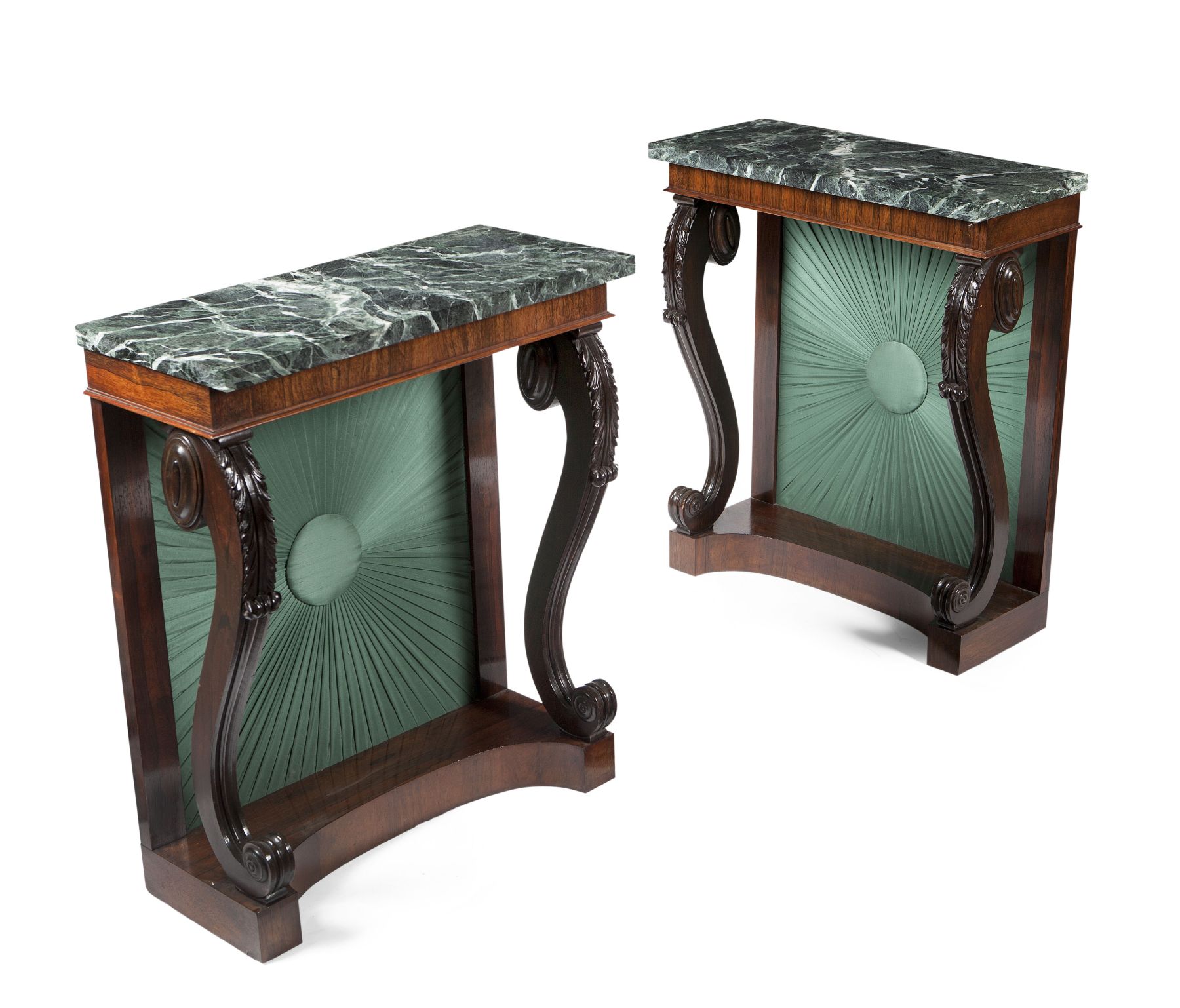 PAIR OF REGENCY ROSEWOOD AND MARBLE TOP CONSOLE TABLES