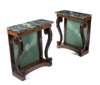 the rectangular green veined marble tops over a plain frieze raised on acanthus carved scroll supports and green silk lined back panels, on a shaped plinth base (2)