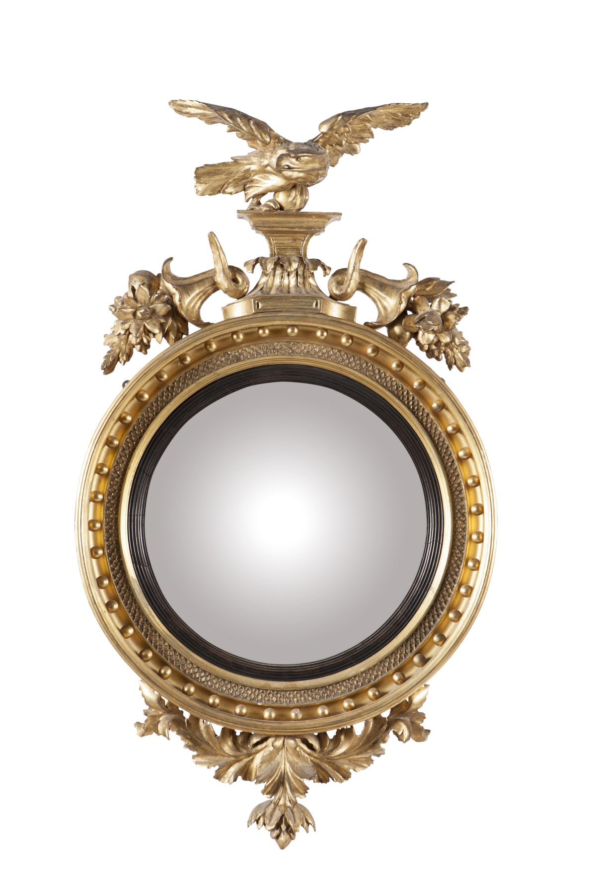 the circular convex plate in an ebonised reeded slip and fishscale moulded frame with ball mounts, surmounted by an eagle and cornucopia cresting and a foliate dop finial