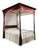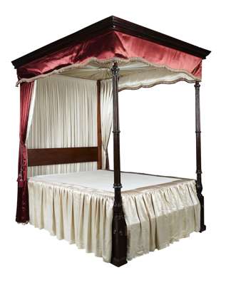 the dentil moulded cornice above fluted and foliate carved posts, hung with deep red and cream silk hangings and bedskirt