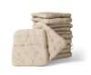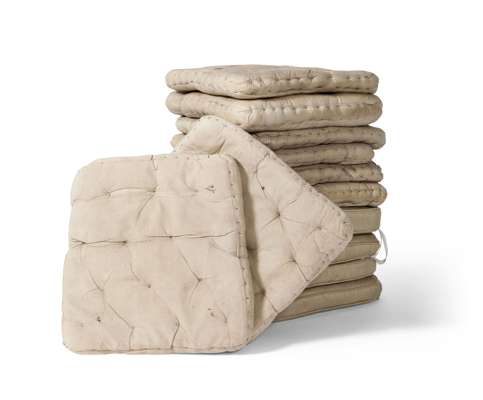 comprising two armchairs and eight side chairs, with foliate brass inlaid curved back rails over a horizontal splat carved with rosettes and lotus, over caned seats, the armchairs with high scrolling arms, raised on sabre legs; with original horsehair tufted pads (12)
