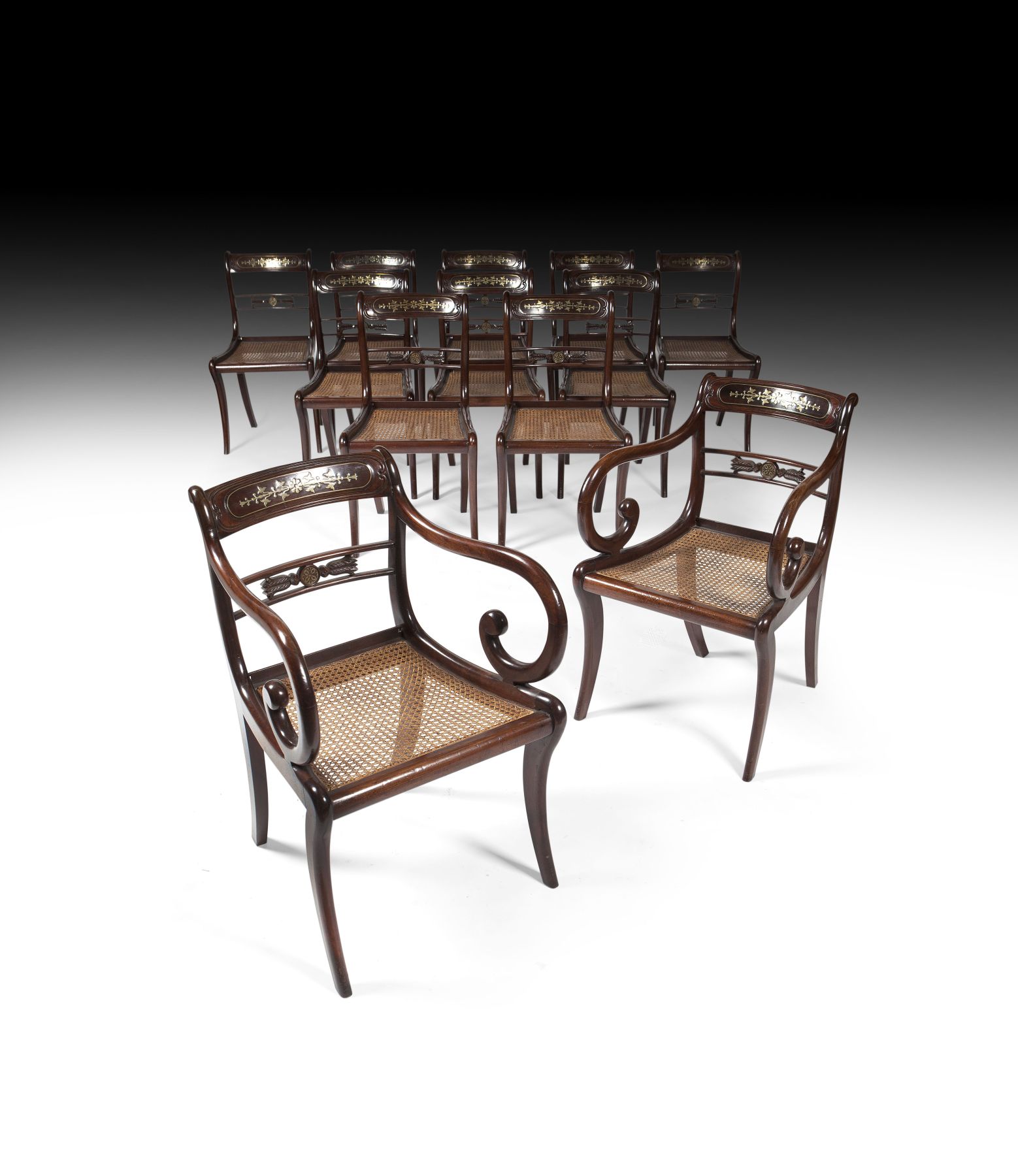 FINE SET OF TWELVE REGENCY BRASS INLAID DINING CHAIRS