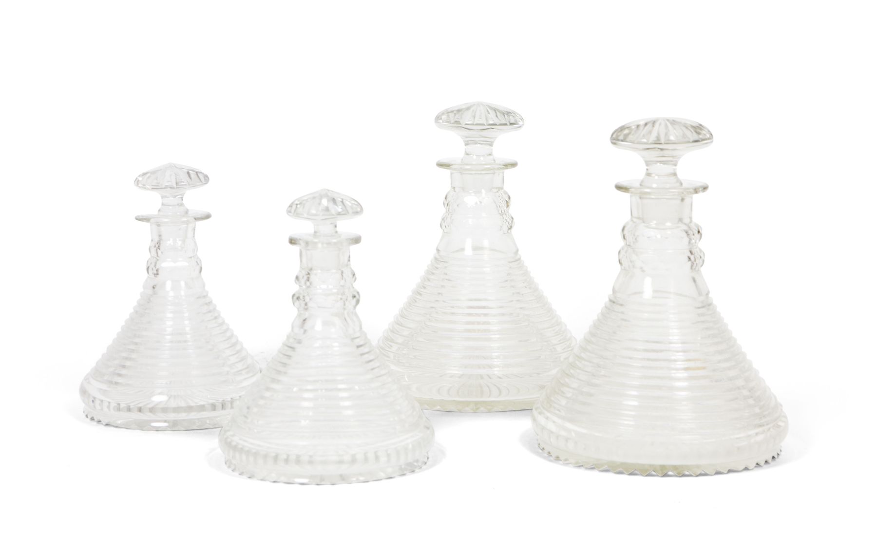 comprising a larger pair and a matching smaller pair, each with a star cut flattened stopper and double faceted ring necks over a stepped cut body and star cut base (4)