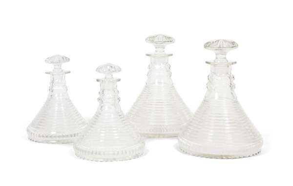 SET OF FOUR REGENCY CUT GLASS SHIP DECANTERS
