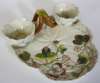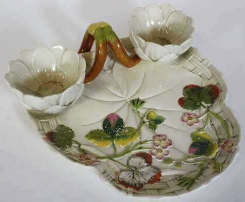 the lily pad shaped dish with an ozier border and two lotus blossom bowls and split stem handle, moulded in relief with strawberry vines and flowers, impressed marks