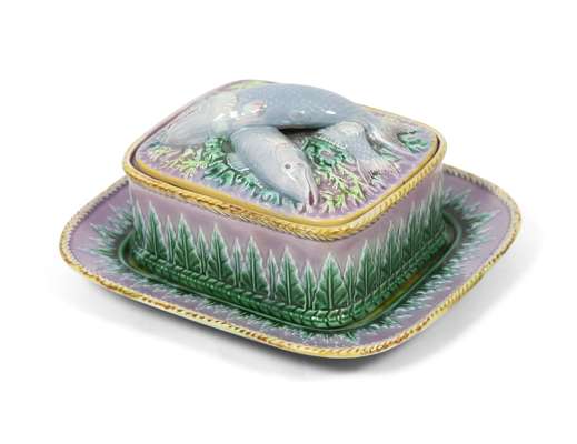 MAJOLICA SARDINE DISH, STAND AND COVER, CIRCA 1880