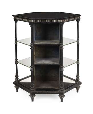 the hexagonal top with an inset mirrored panel above an arrangement of open shelves, raised on turned bun feet