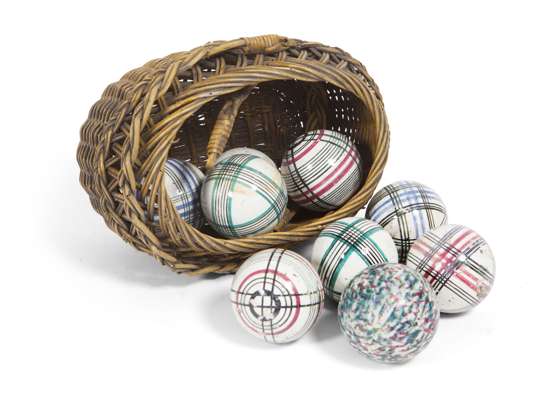 comprising nine bowls with one white, the others with striped or sponged decoration, in a wicker basket (9)