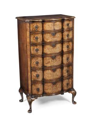 QUEEN ANNE STYLE WALNUT AND BURR WALNUT TALL CHEST OF DRAWERS
