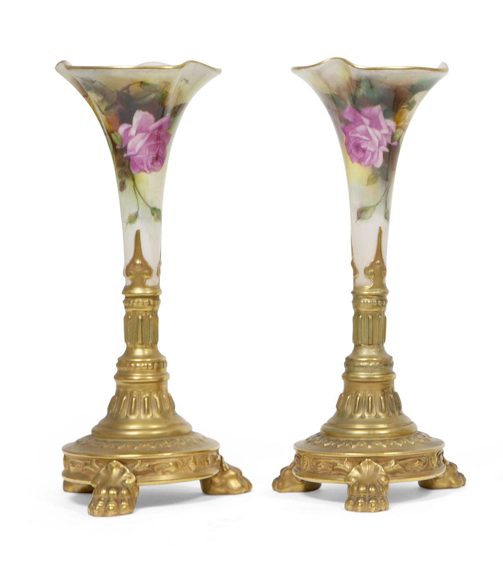 PAIR ROYAL WORCESTER TRUMPET VASES BY F.J. BRAY