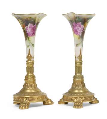 each with a wavy rim and painted with roses, raised on circular gilt bases raised on paw feet, one signed F.J. Bray, the other unsigned, printed puce marks (2)