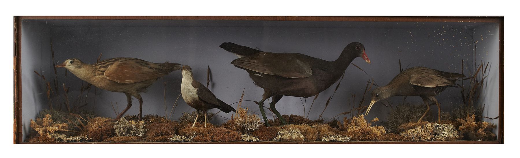 comprising four different waders and sandpipers in a naturalistic setting with a painted background, in a long glazed case