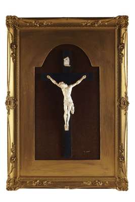 the finely modelled figure of Christ mounted on an ebony cross beneath the insription 'INRI', mounted on a brown plush lined board in a gilt wood frame; together with another earlier giltwood frame