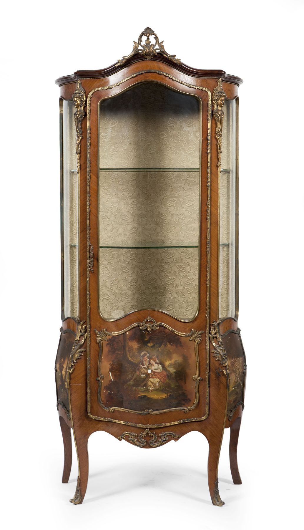 the arched and moulded cornice over a serpentine glazed door and side panels revealing a green upholstered and shelved interior, the lower panels painted with scenes of courting couples, raised on cabriole legs, the whole outlined in brass and with gilt bronze mounts