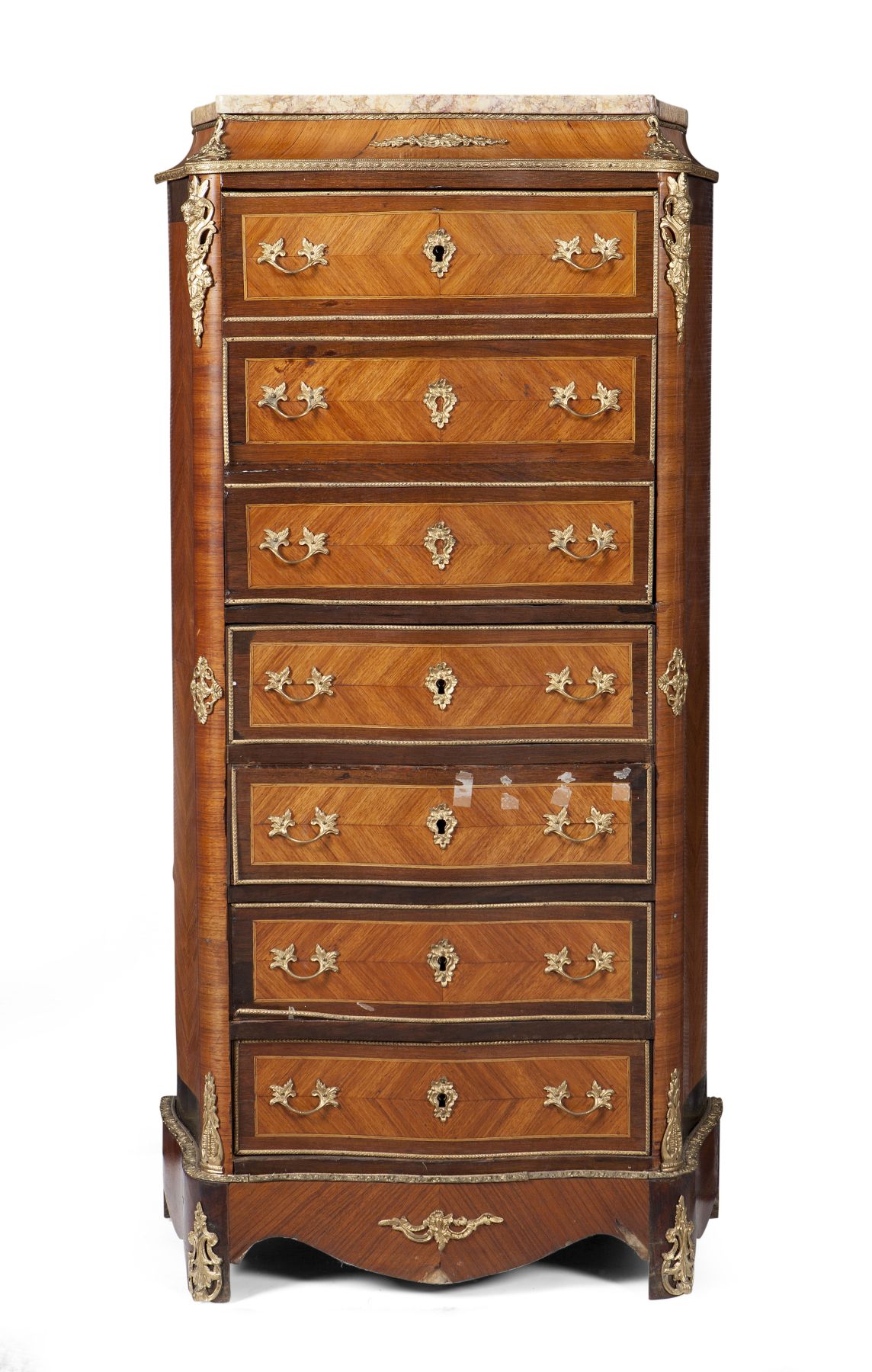 the serpentine yellow marble top over a fall front revealing a writing surface and fitted interior, over five drawers with gilt metal mounts throughout
