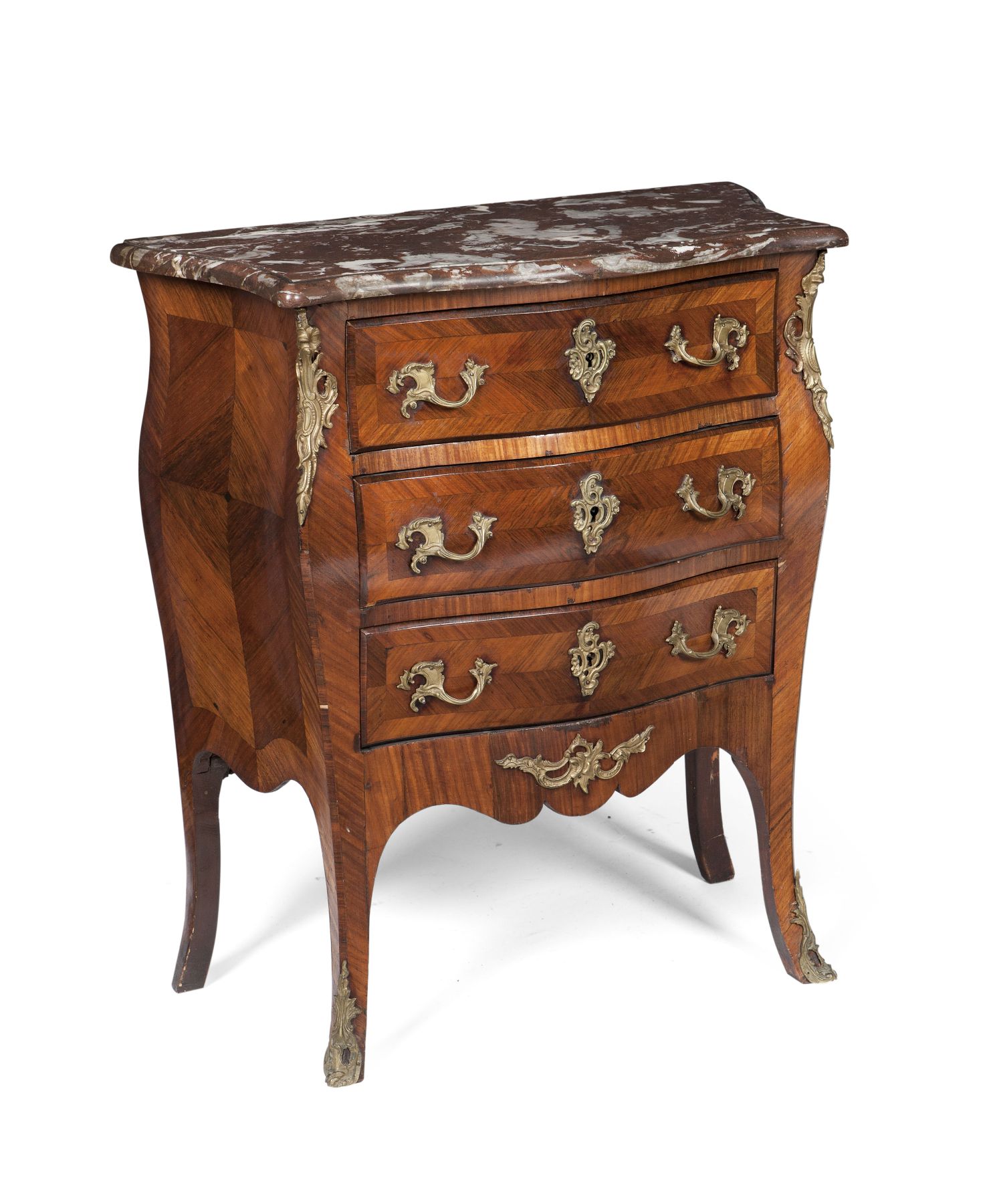 the serpentine breche marble top with a moulded edge over three quarter veneered and banded drawers, with a shaped apron and cabriole legs, gilt metal mounts throughout