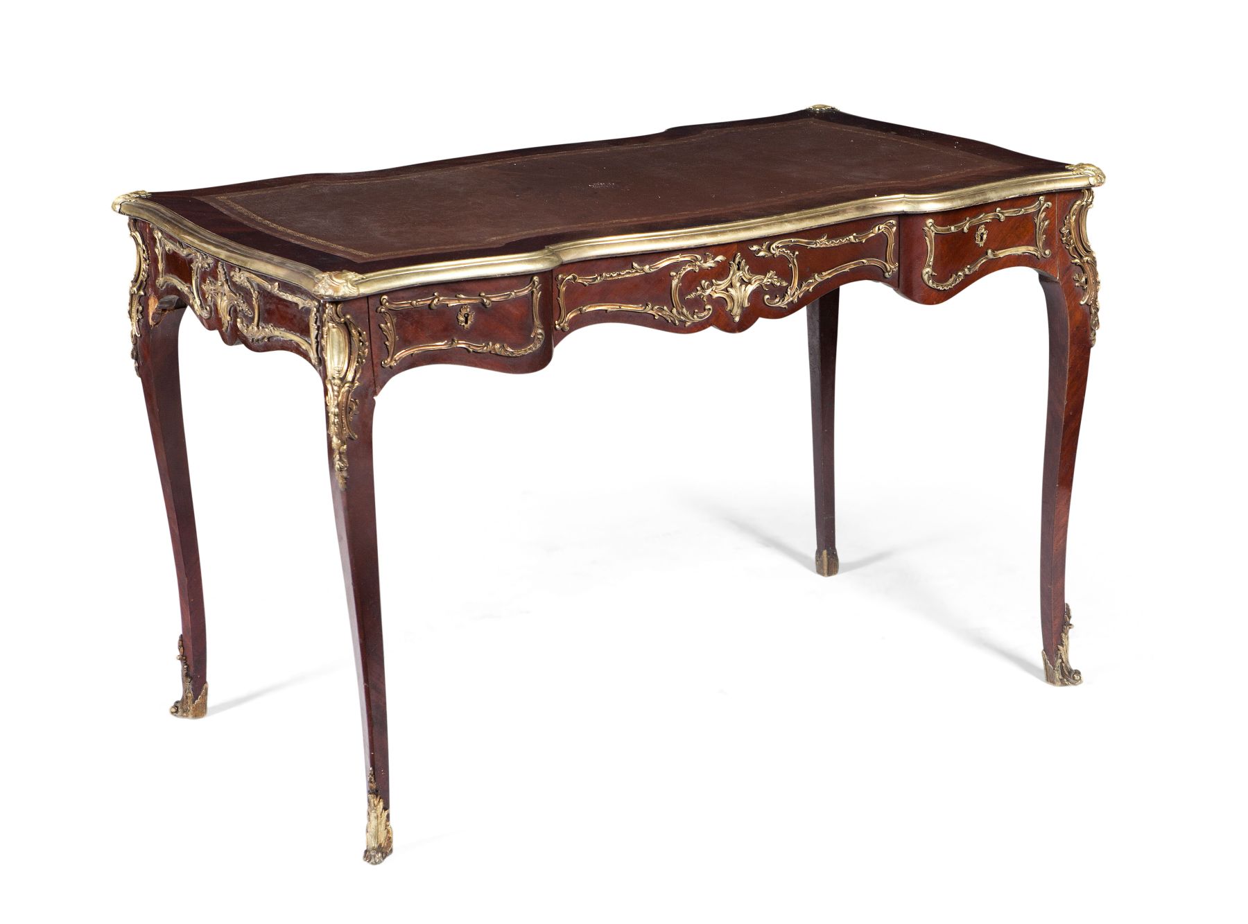 the shaped rectangular top with a brown leather insert and brass banded edge and gilt metal foliate corner mounts, above a serpentine frieze with three short drawers with gilt metal mounts, raised on square cabriole legs ending in sabots