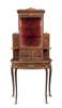 in two parts, the superstructure with a central glazed cabinet with a red plush lined interior over a pair of doors with Vernis Martin panels depicting a courting couple, flanked by shelved tiers; the lower part with a bowfront over a frieze drawers, raised on cabriole legs ending in sabots, the whole with brass banding and gilt metal mounts