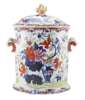 of octagonal form with twin mask handles and a domed cover, decorated in the Imari palette with blossoming foliage, printed blue mark