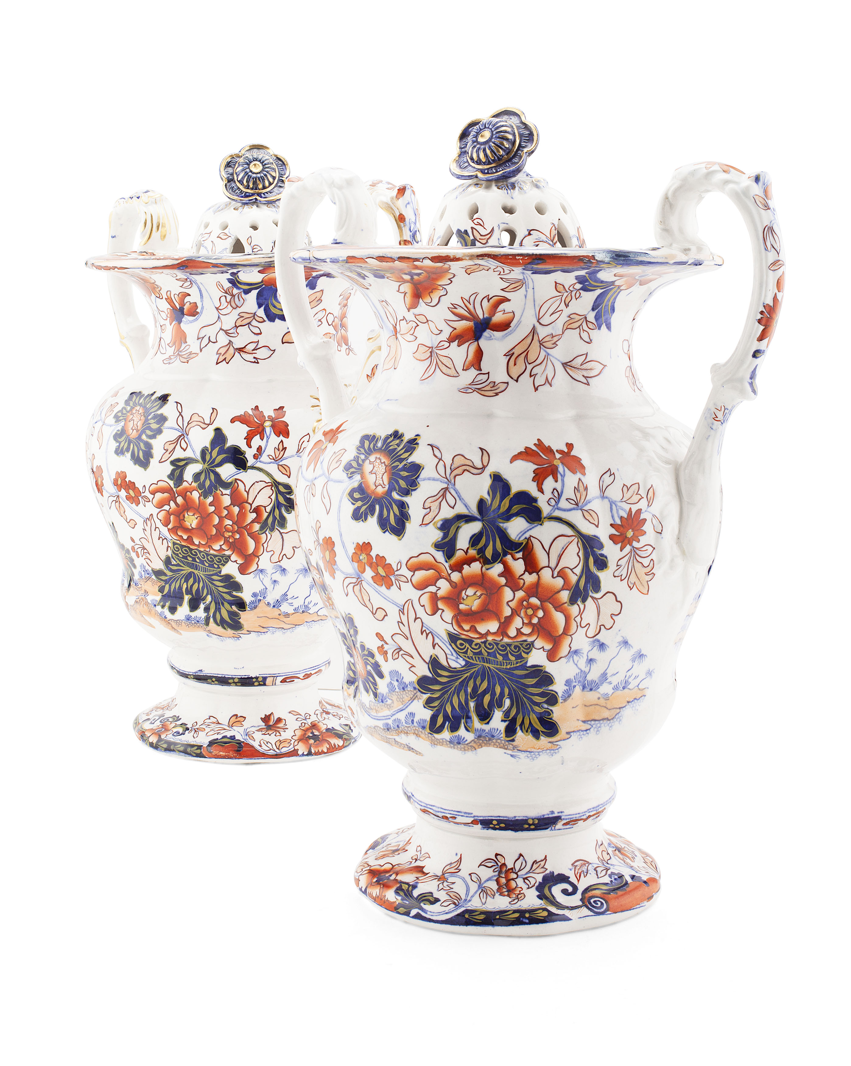 PAIR OF ENGLISH STONE CHINA 'AMHERST JAPAN' PATTERN COVERED URNS
