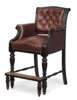 the rectangular brown leather button upholstered back and enclosed scroll arms above a deep seat, in an acanthus carved mahogany frame, raised on tall turned and reeded legs joined by horizontal stretchers and a footrest