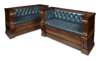 the square back and seats covered in studded and buttoned blue leather, with acanthus carved S scroll arm facings above a panelled apron, raised on shaped plinth bases, each bearing 'John Taylor & Sons' stamp (2)