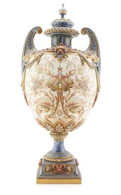 the oviform body with high scrolling wing handles and a domed cover with ball finial, decorated with foliage and fruit on an ivory or blue ground, raised on a circular foot
