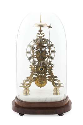 the silvered chapter ring with blue steel hands, the single chain fusee movement with an anchor escapement and striking on a bell, together with a glass dome and stand