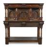 the rectangular top over a floral carved frieze raised on cluster columns at the corners, above a double arched panel door flanked by two further arched panels all with floral marquetry; the lower part with a long frieze drawer carved with strapwork and raised on further column clusters, raised on block feet