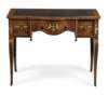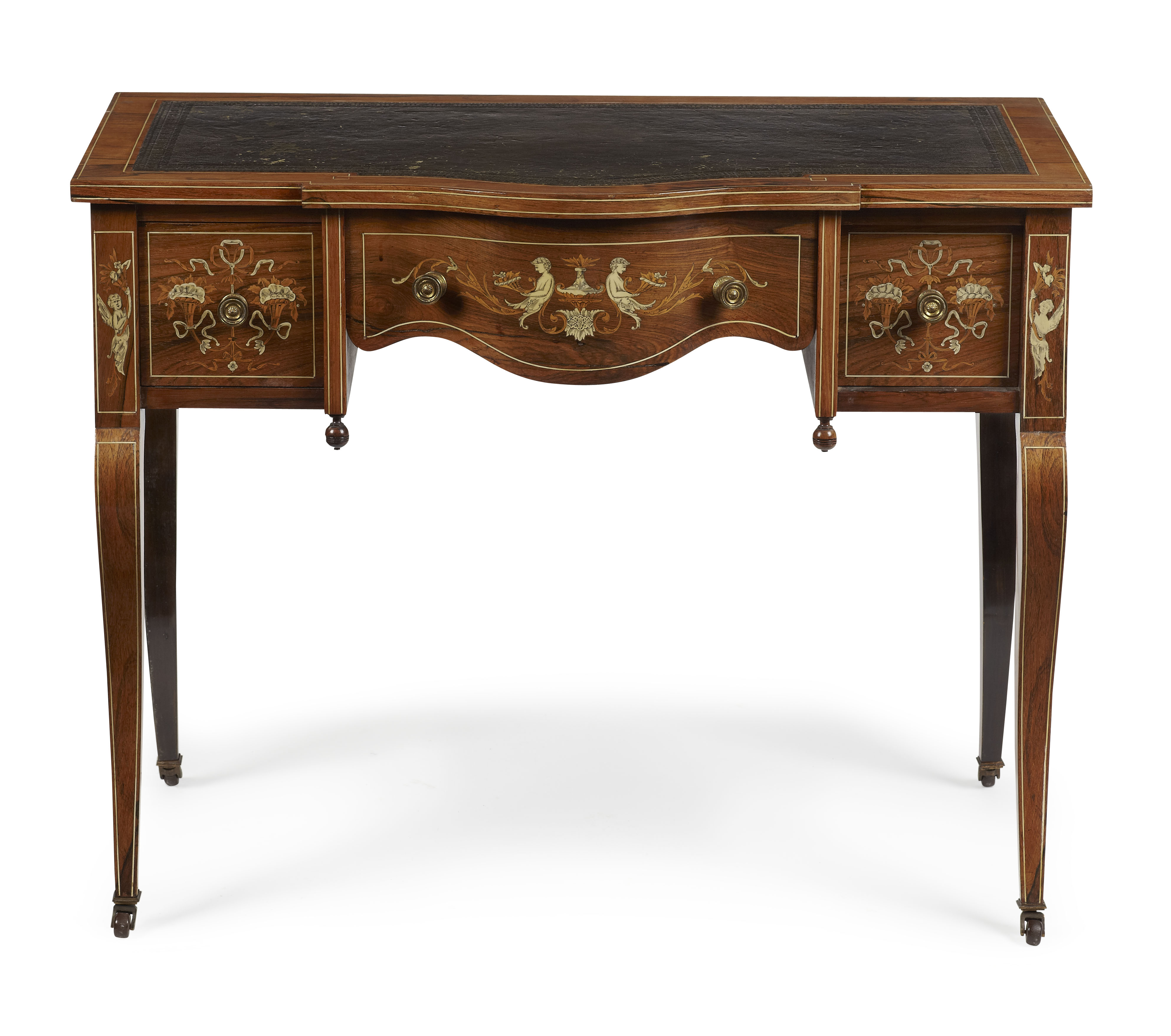 the serpentine shaped top with an inset leather writing surface, below are three frieze drawers inlaid with cherubs, cornucopia and foliate scrolls, raised on sabre legs terminating in ceramic casters