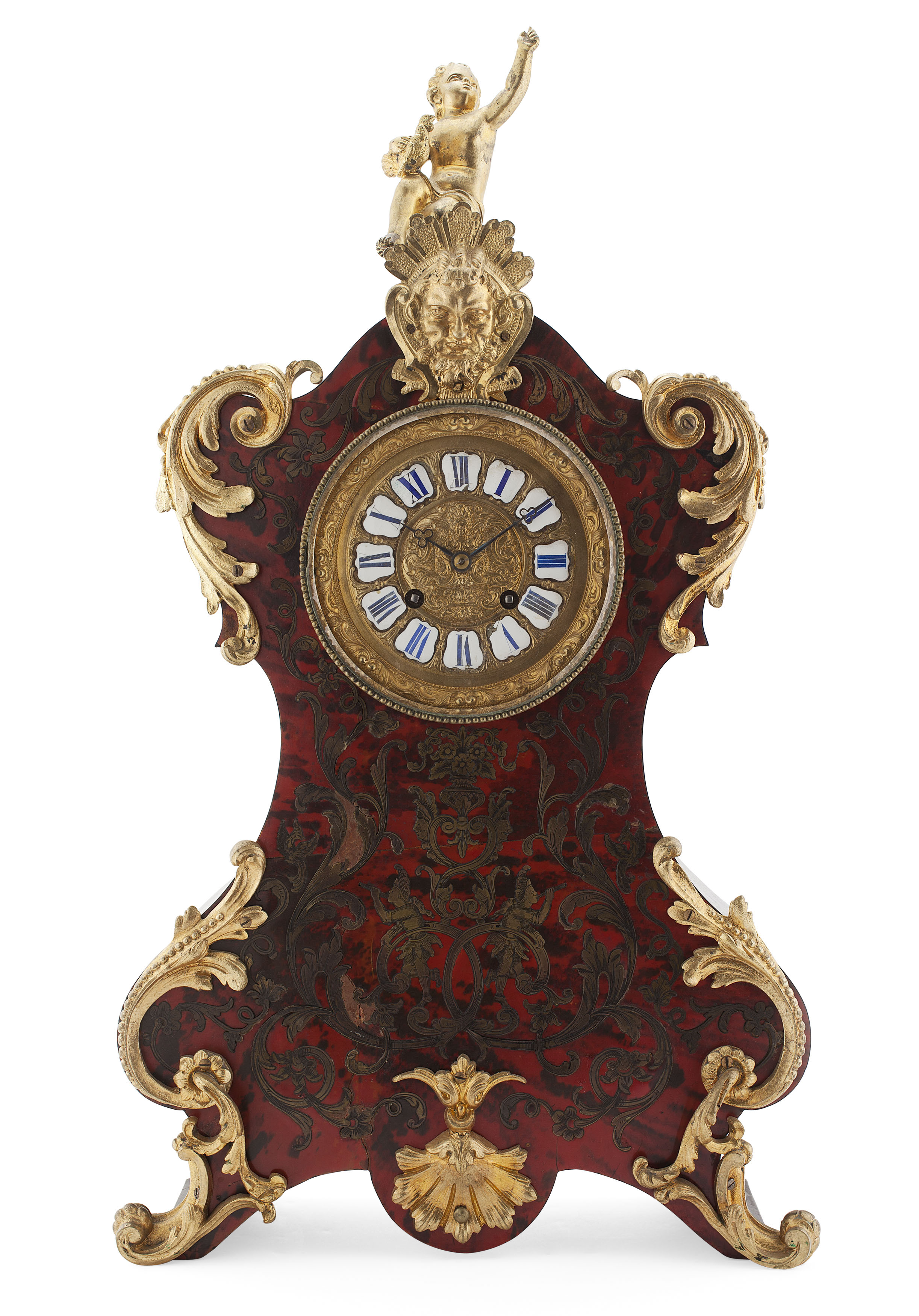 with gilt bronze mounts, the gilt embossed dial with white enamel chapters and blue painted Roman numerals, the 8-day movement striking on a bell, the shaped case surmounted by a cherub and with applied rococo scroll mounts