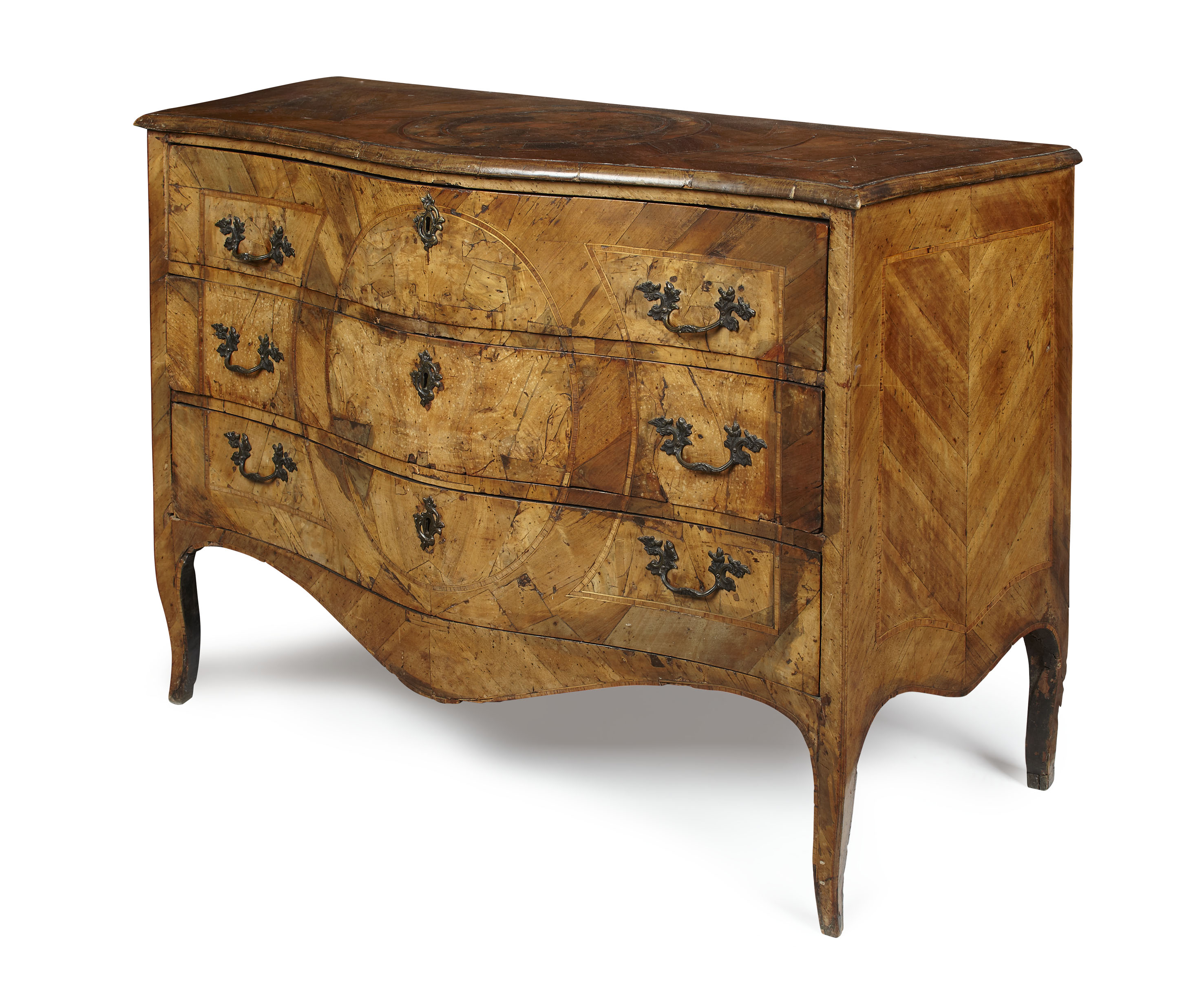 the moulded serpentine top with an oval parquetry cartouche, over three long drawers centred by a further cartouche, the sides with chevron panels, above a serpentine apron and raised on short cabriole legs
